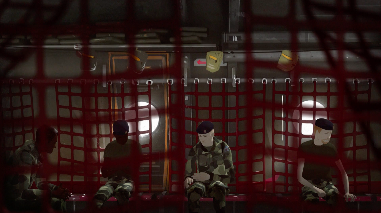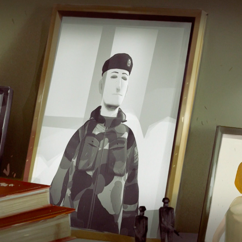 A muted colour palette and considered character design give the film the space to explore the narrative themes and properly tell Hugh’s story, using higher contrast and quick transitions to denote the stressed and claustrophobic feelings of PTSD, which then slow and soften as Hugh seeks help and begins to feel more hopeful.